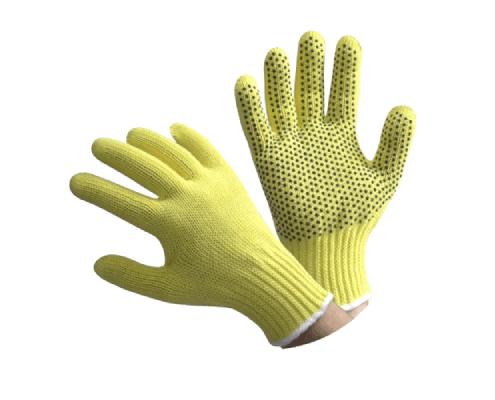 Luva de segurança tricotada com fibra de Kevlar, fibra de vidro e silicone. Punho em elástico. O silicone na palma oferece maior aderência para manusear peças, chapas e ferramentas.