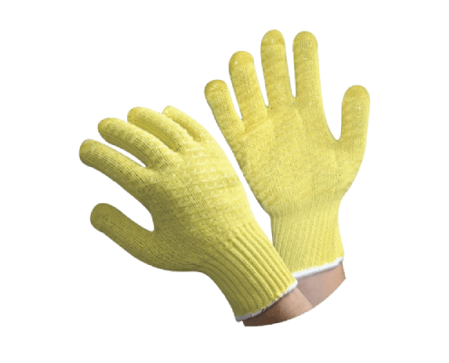 Luva de segurança tricotada com fibra de Kevlar, fibra de vidro e silicone. Punho em elástico. O silicone na palma oferece maior aderência para manusear peças, chapas e ferramentas.