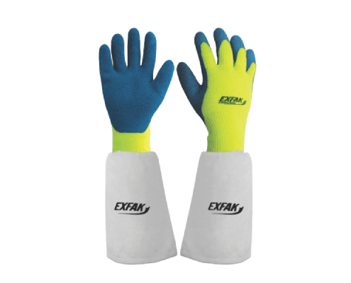 Luva de segurança, tricotada em poliéster e Kevlar com costura 100% em fio acrílico, látex texturizado na palma e ponta dos dedos, punho com mangote de 20cm.