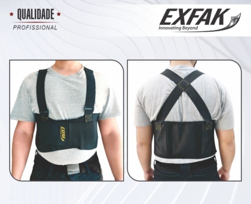 Descrição: Cinta ergonômica com base em elástico ou tecido, anatomicamente projetada para uma menor tensão na região lombar, com a finalidade de proteger a coluna de esforços intensos. Suspensório em elástico de baixa densidade para o conforto, ajustável por presilhas plásticas.