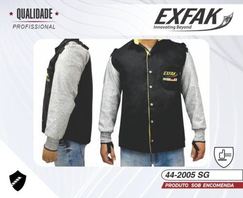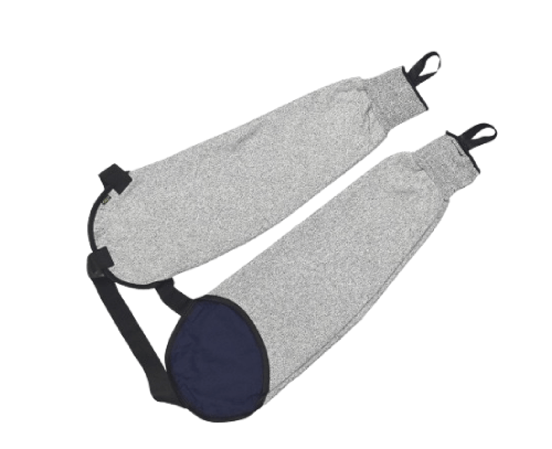 Mangote duplo interligado por alça nos ombros; Tecido resistente a corte (nível 5) na parte externa; Forrado com brim leve na parte interna; Mangas com dedeiras.