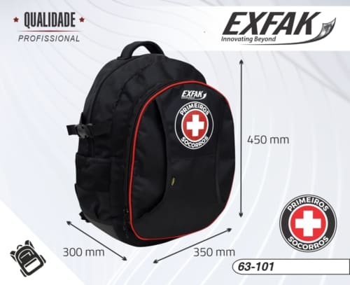 Mochila personalizada Exfak Primeiros Socorros Dois compartimentos com zíperes, dois bolsos laterais, amplo espaço interno e alça reforçada nas costas.
